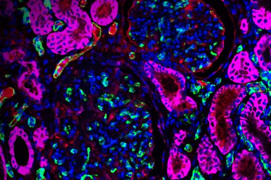 CRISPR Kidney Supported Life in the NHP for 758 Days Legend: Working from the hostile NHP environment, CRISPR-edited porcine kidney survived and supported life for 758 days. Green: CD31+ endothelial cells; fuchsia, human CD46; C4d, red; blue, nucleus. Credit: Violette Paragas, eGenesis.
